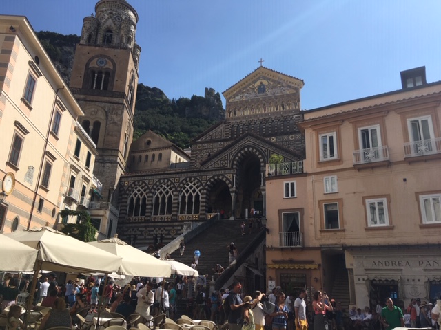 We also swam off the boat again with snorkels. The turquoise sea was full of silver, yellow and black fish darting one way then the other – a synchronised shoal dancing as one – surrounding us. Arriving in Amalfi was an experience – the pretty houses, like little boxes, hewn from stone jut out above the sea – a rainbow pallet of pastel shades clinging to the cliff. I was trying to imagine what it would be like to live there. The view would be sensational but all those people! The air was filled with Italians chattering excitedly and gesticulating wildly, other European accents drifted in and out too. The sun was searing. Pale British people were huddling together in a tiny patch of shade. I could smell coffee, sunblock and cigarette smoke. The sea looked incredibly inviting but there wasn’t a spare inch on the beach which was covered in stripy parasols shading nut brown bodies lying on loungers. We became part of the throng of visitors wanting to explore. I found it fascinating and exhilarating and unnerving as it was just so intense.
