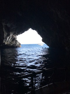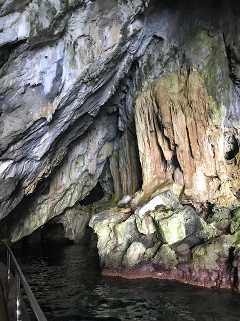 It was a relief to board the boat and feel the wind in my hair. We were expecting to just head back but Allessandra said they had a surprise for us. The Captain, who I don’t think spoke once during the whole trip, started heading for the shoreline but not to habitation. ‘We are going to a special place only accessible by boat. It is called Pandora’s Cave and everyone who enters must make a wish.’ she told us. The boat seemed to be travelling fairly fast towards a small gap. The captain obviously knew what he was doing and expertly manouvered us inside where it was deceptively large. It felt odd going from brilliant sunshine into the gloom of the cave the walls were sharp stone and a rainbow of shades from purple, orange, green, yellow and grey.