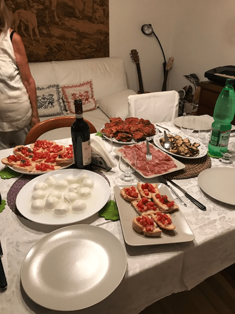 The hostess, Allessandra, was lovely and helped with plasters and things although none of them would stick and Jase had to keep using tissues to stem the flow. She said, ‘I know what will help!’ and pulled out an ice cold bottle of Prossecco and some chunks of honeydew melon which I had to feed to Jase as he wouldn’t stop bleeding.