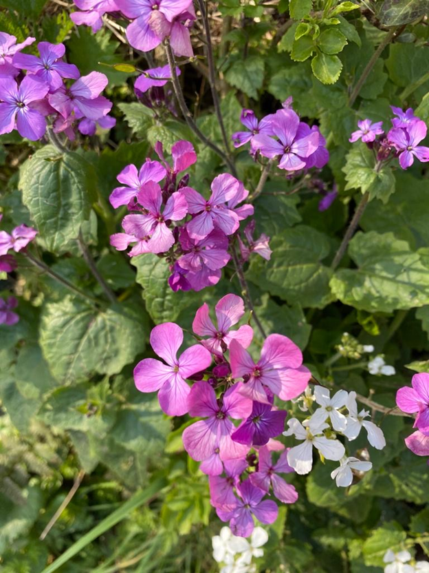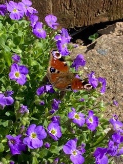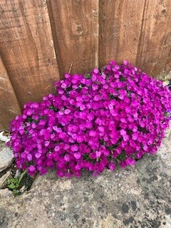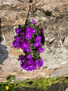 For many years I used to admire the stonewalls around where I live, because at this time of year, they are decorated with purple patches of Aubretia As time wore on I began to covet their gorgeous flowers and want to transform the stone wall outside my house. So, three years ago I decided to buy some seedlings in the hope that I could grow my own. After careful planting, a couple survived; some succumbed to frost, others just gave up so, I kept buying more and more each year – determined to have my dream wall – and finally I have been rewarded. Every time I go out the gate and see my wall, dripping with the bunches of little flowers ranging from indigo, violet and one an intense shade of magenta, I can’t stop smiling. And I’m not the only one who loves it, it’s a favourite with butterflies too. I went outside earlier and found a man out on a walk admiring it. He said, ‘your wall looks lovely. I’ve got the purple ones but I want that colour now’ and he pointed to the magenta one. Finally people are admiring my wall after my hard work.